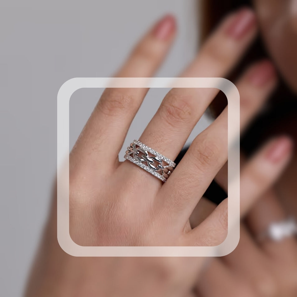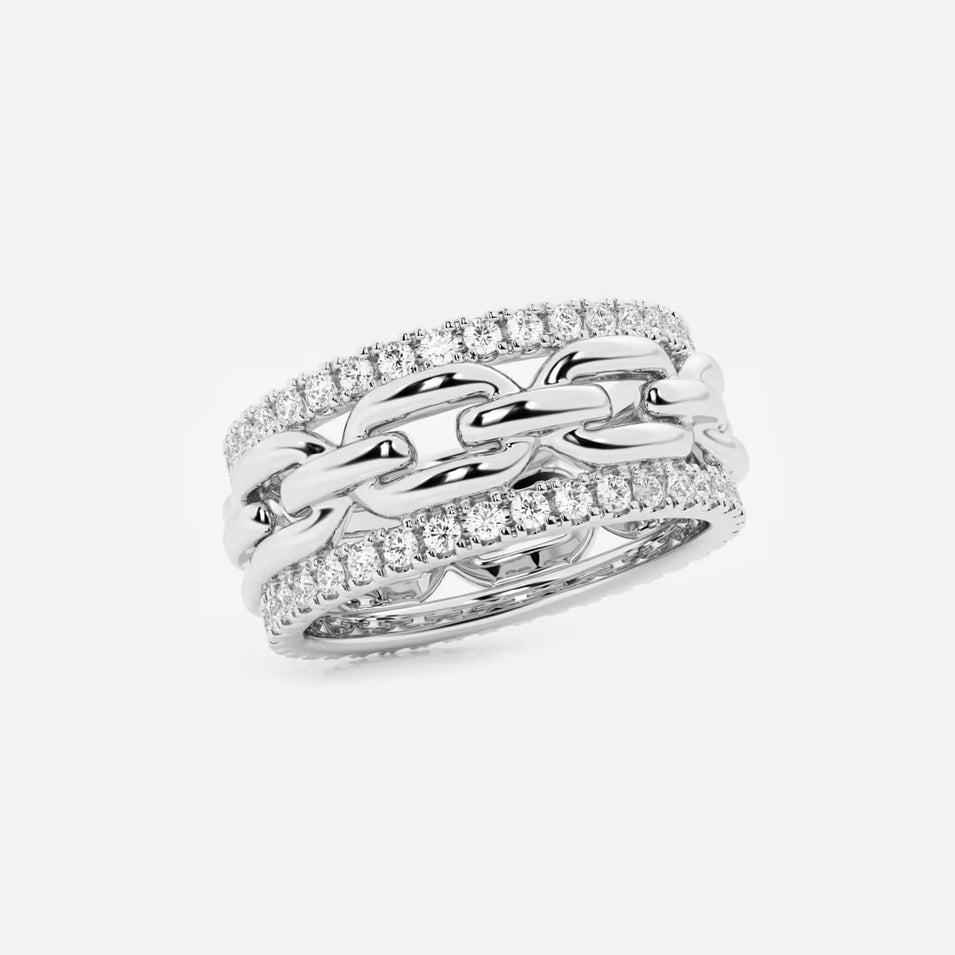 Shop nowEnjoy high-octane glamor with this diamond link band. Featuring a bold chain link center band surrounded by sparkling rows of Moissanite diamonds, this ring is made to stand out.