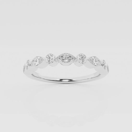 A little bit of melange-e-trois? Marquise and round-shaped Moissanite diamonds are framed with a beaded gold frame. Stackable or solo, we love it either way.