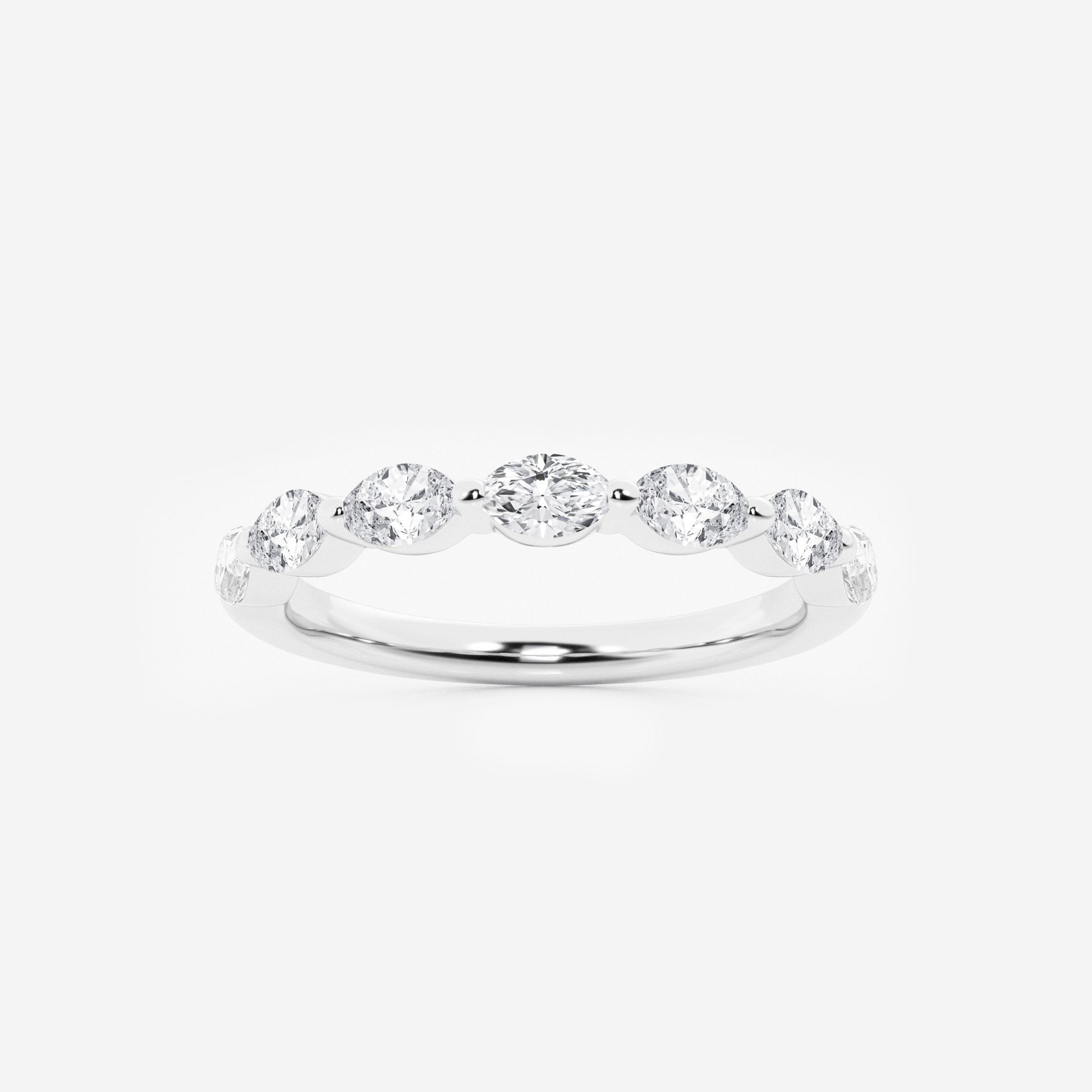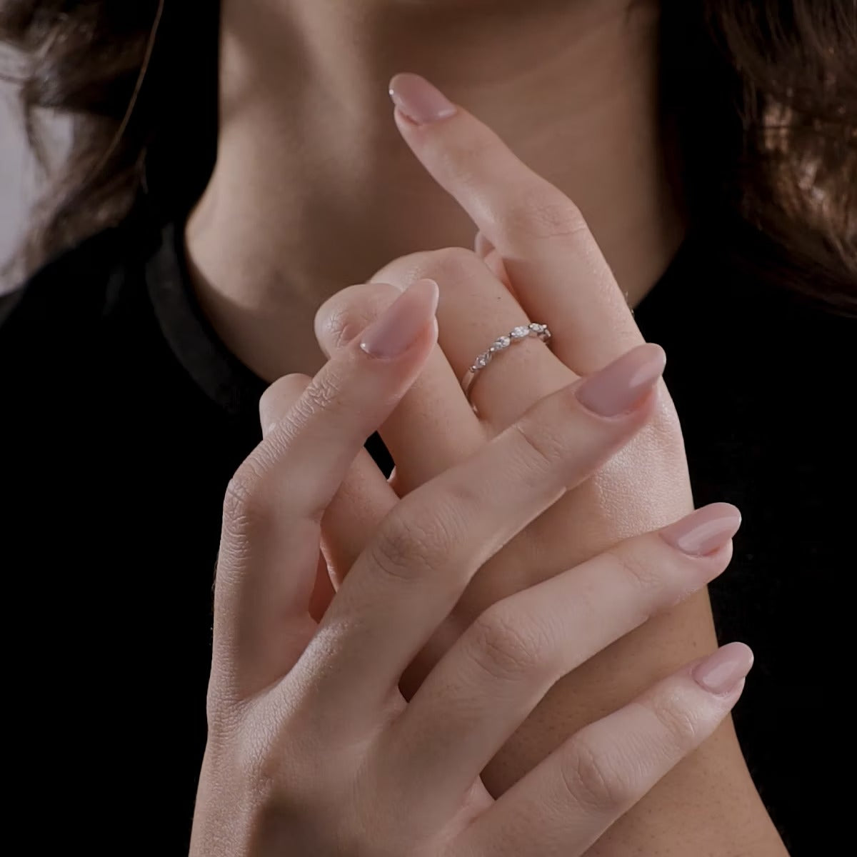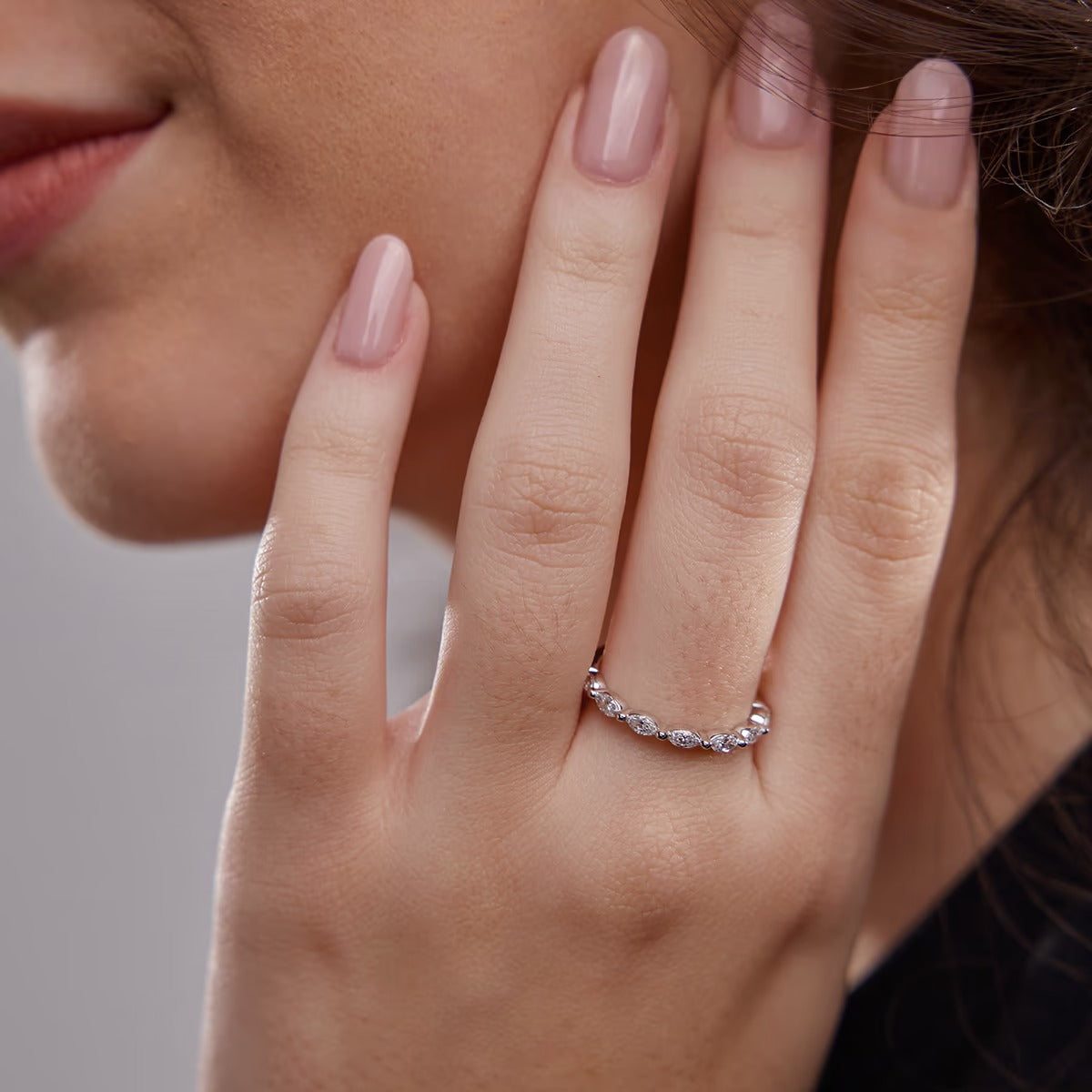 Interesting and chic, marquise-shaped moissanite diamonds sit east to west in this marvelous stackable ring. We love stacking them with our baguette and round bands to create a mix of shapes and lots of fun.