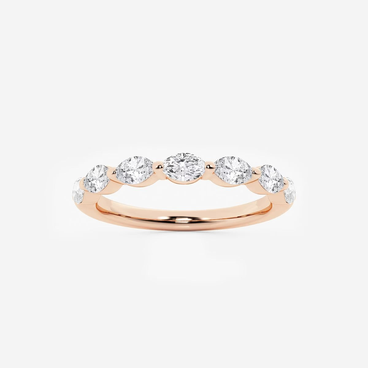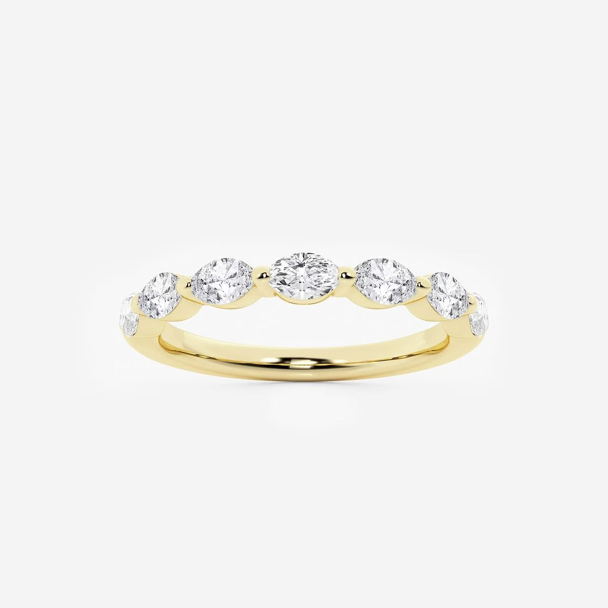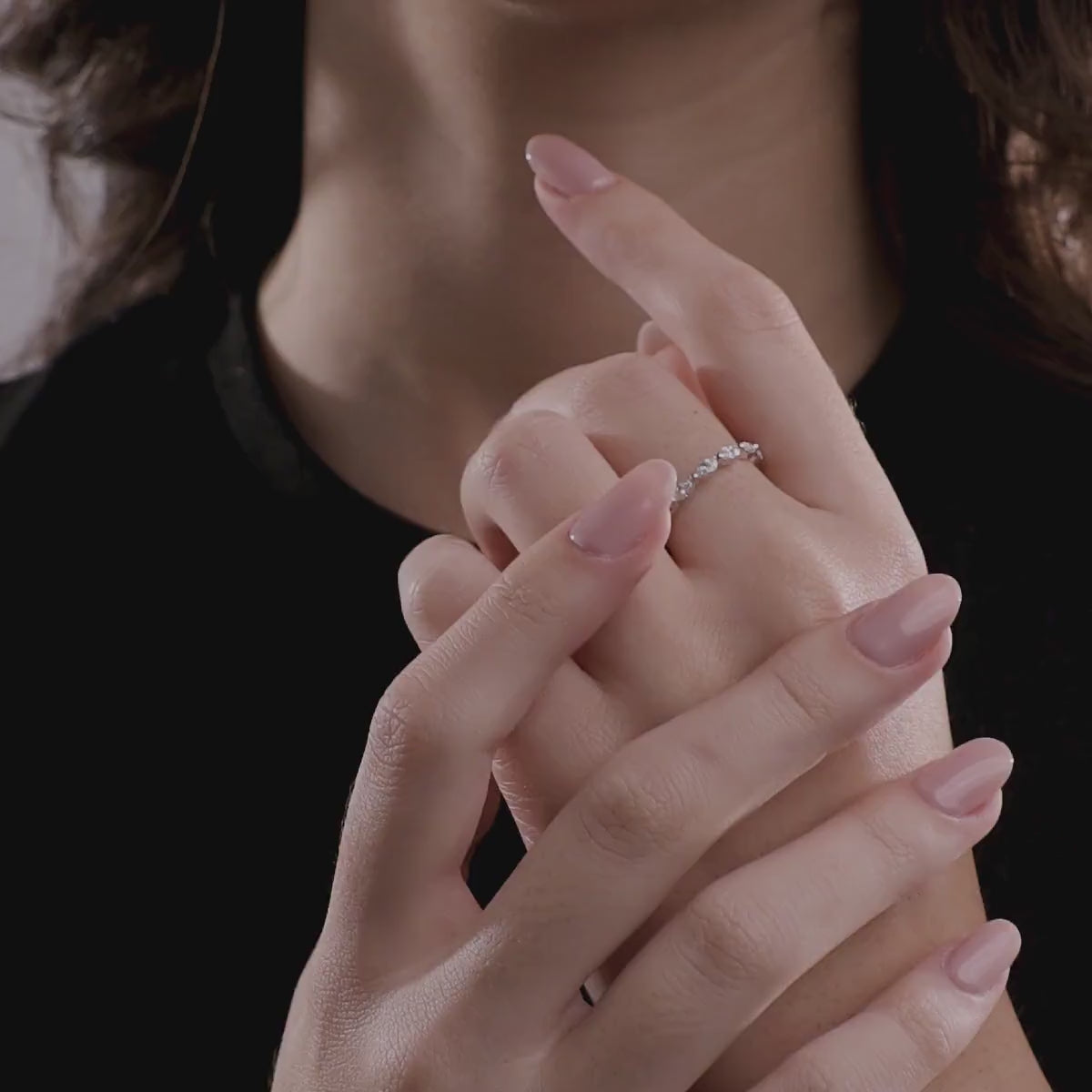 Interesting and chic, marquise-shaped moissanite diamonds sit east to west in this marvelous stackable ring. We love stacking them with our baguette and round bands to create a mix of shapes and lots of fun.