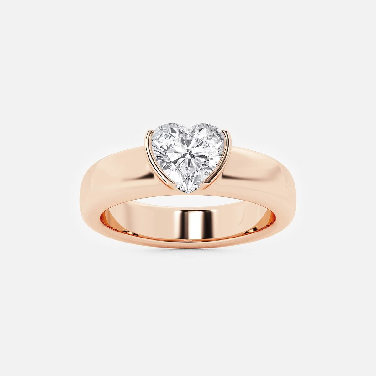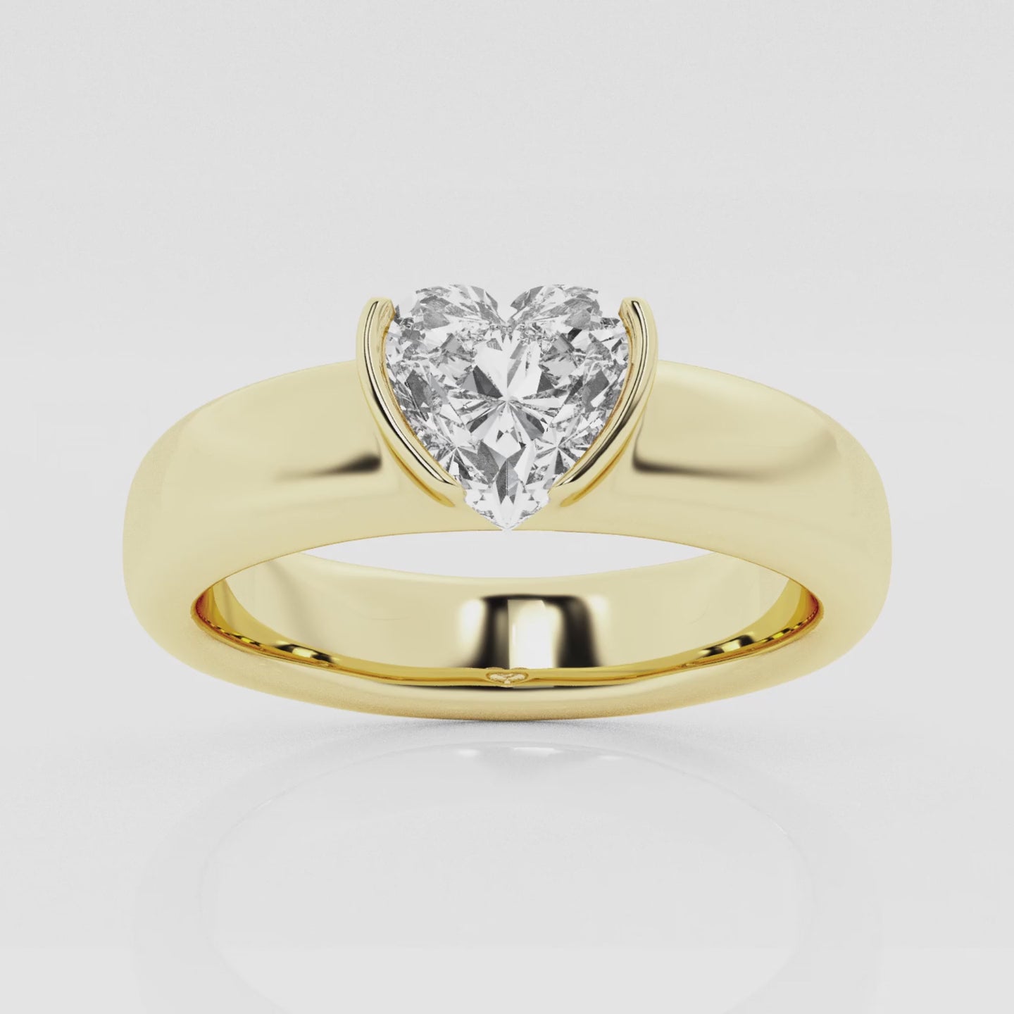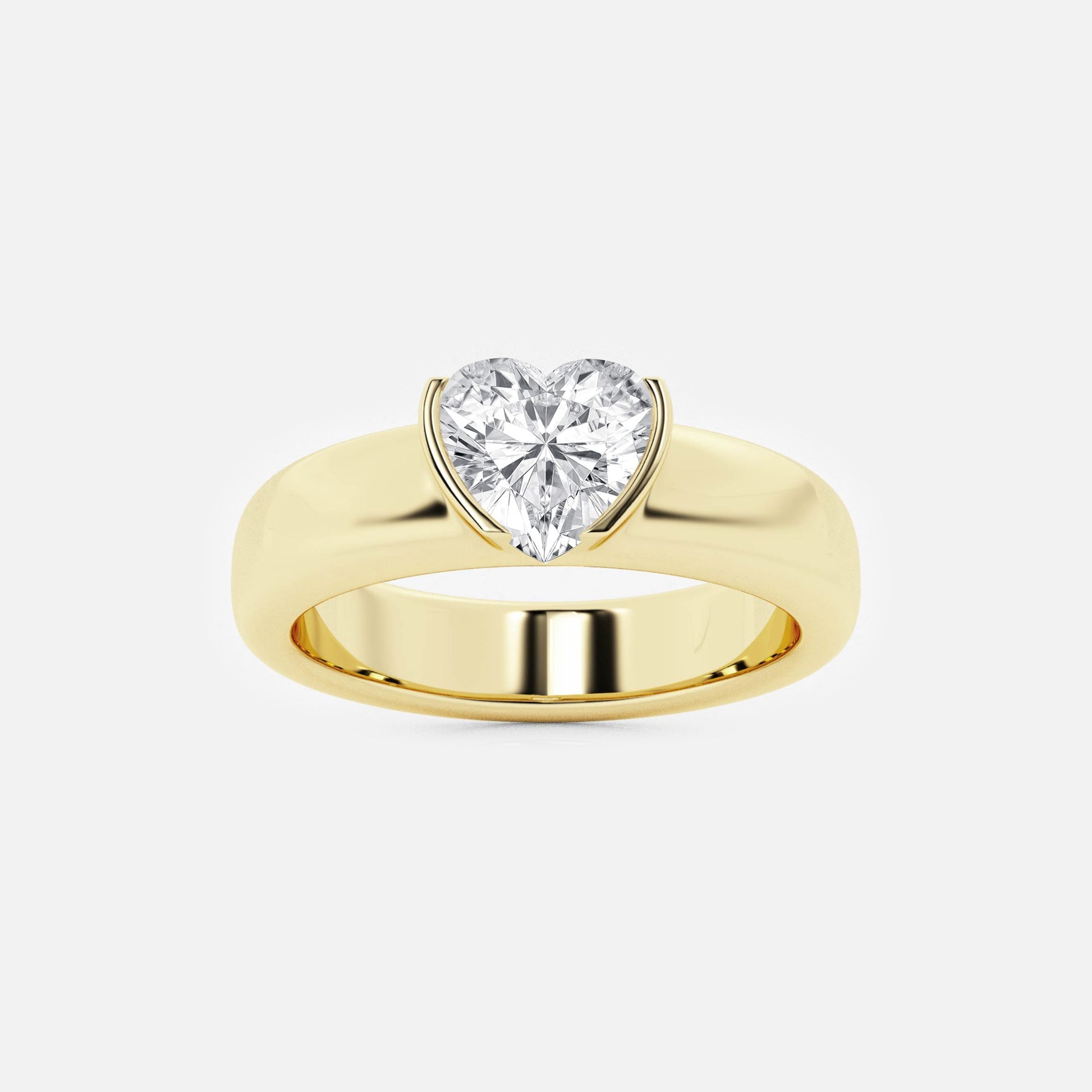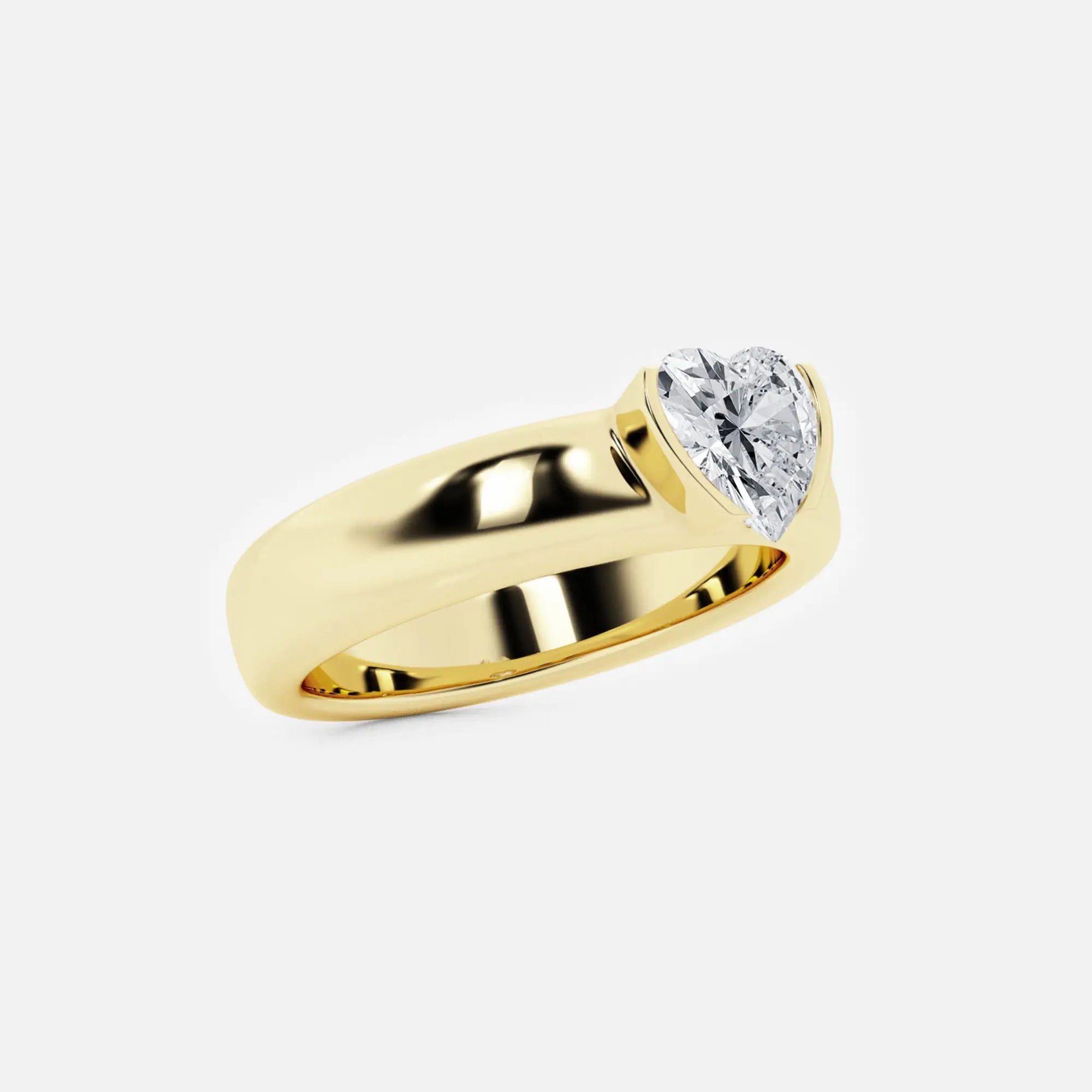 True romantics will adore this half bezel heart shape diamond ring. A sparkling lab grown heart shape diamond is securely set in the classic gold band, recreating a warm embrace on your finger! Show your love in the most luxurious way possible with this sweet heart shape diamond ring.