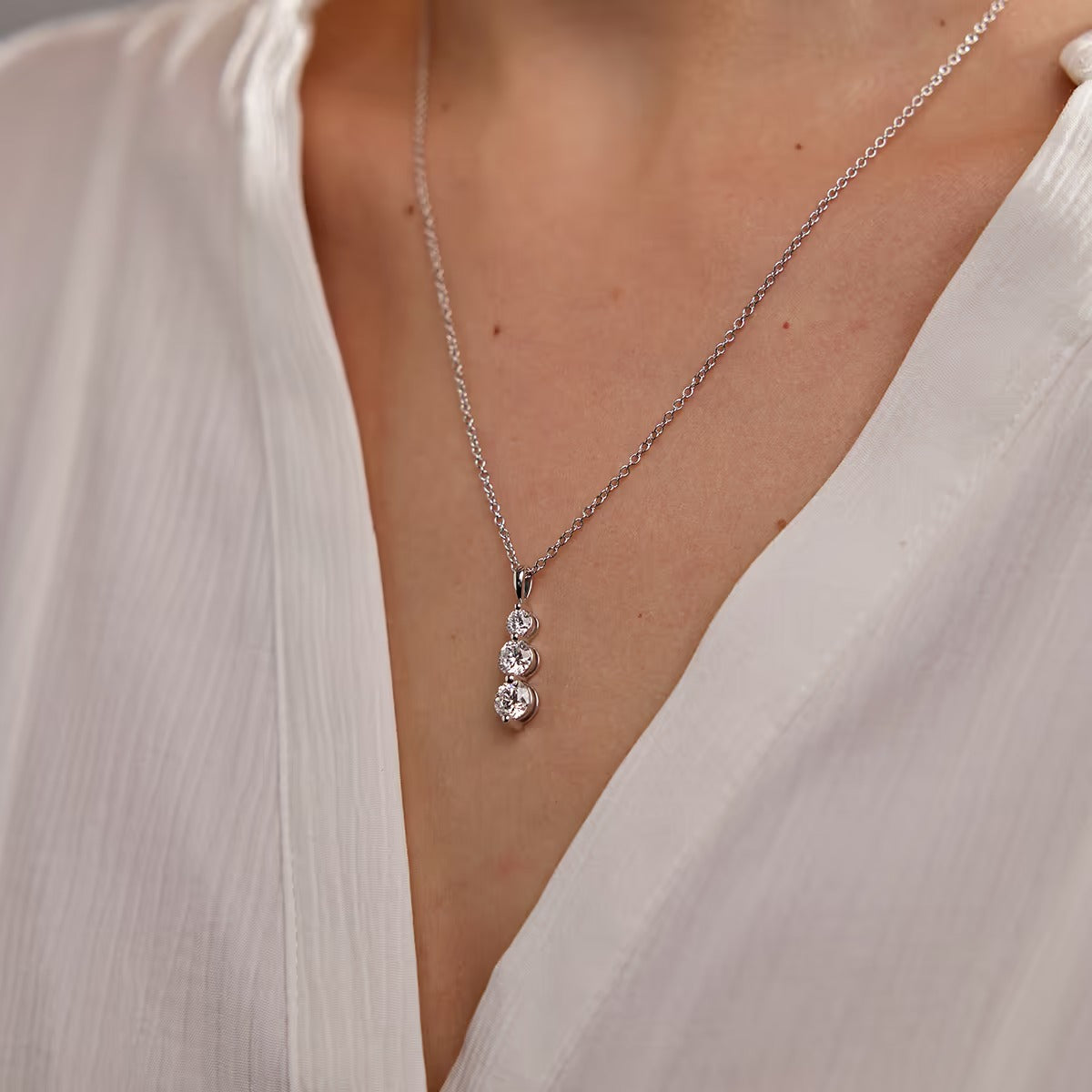 A perfect anniversary gift, this pendant features three exquisite lab grown diamonds set in a graduating pattern to symbolize the journey of your relationship.